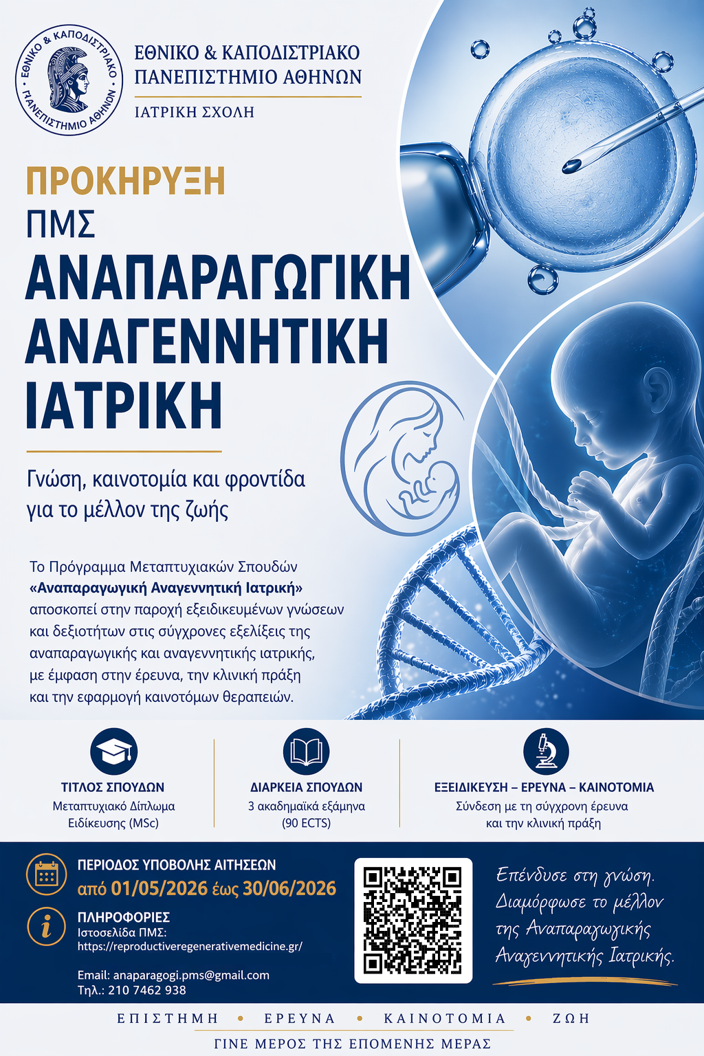 Η Αναπαραγωγική Ιατρική είναι ένας τομέας που εξελίσσεται συνεχώς και ασχολείται με τη φυσιολογία, την παθολογία και την ενδοκρινολογία του αναπαραγωγικού συστήματος στη γυναίκα και τον άνδρα, καθώς και με γενετικές παθήσεις, ενώ παρεμβαίνει τόσο συντηρητικά όσο και χειρουργικά στη θεραπεία τους. Έχει να επιδείξει σημαντική προσφορά στα ζευγάρια που αντιμετωπίζουν προβλήματα υπογονιμότητας. Στο πρόγραμμα σπουδών του ΠΜΣ οι φοιτητές εκπαιδεύονται στις τεχνικές της Υποβοηθούμενης Αναπαραγωγής, αλλά και της Μοριακής Βιολογίας της Αναπαραγωγής. Η Αναγεννητική Ιατρική είναι ένας νέος τομέας της Ιατρικής έρευνας που ασχολείται με τη μελέτη των βλαστικών κυττάρων και την εφαρμογή των αποτελεσμάτων της έρευνας αυτής στην κλινική πράξη, με στόχο τη θεραπευτική παρέμβαση σε σημαντικό αριθμό ασθενών. Στο πρόγραμμα σπουδών του ΠΜΣ δίνεται έμφαση στη μελέτη των βλαστικών κυττάρων τόσο σε θεωρητικό όσο και σε πρακτικό επίπεδο. Η Αναπαραγωγική – Αναγεννητική Ιατρική λόγω του θεωρητικού και πρακτικού ενδιαφέροντος που τη χαρακτηρίζει, αποτελεί διεθνώς ένα τομέα που απαιτεί ενδελεχή και σε βάθος κατάρτιση, ενώ παράλληλα συνδέει την κλασική Ιατρική με τη βασική έρευνα. Το πρόγραμμα σπουδών του ΠΜΣ θα συνεχίσει να βοηθάει τόσο τους πτυχιούχους των Σχολών Επιστημών Υγείας όσο και τους πτυχιούχους των Σχολών Βασικών Επιστημών να εμπλουτίσουν τις γνώσεις τους σε επίπεδο εφαρμοσμένων τεχνικών Μοριακής Βιολογίας, αλλά και σε κλινικό-εργαστηριακό επίπεδο στην Αναπαραγωγή και Ενδοκρινολογία. Επιπλέον, θα βοηθήσει τους ιατρούς να αναγνωρίζουν σημαντικά ερωτήματα βασικής επιστήμης σε σχέση με κλινικά ευρήματα και να εφαρμόζουν εργαστηριακές τεχνικές ώστε να κατανοήσουν την παθοφυσιολογία των ασθενών.